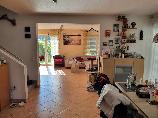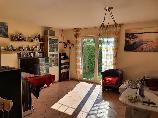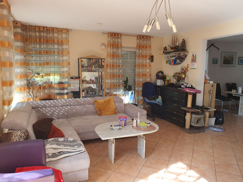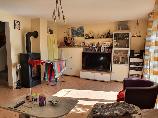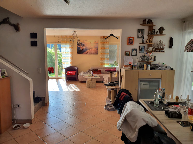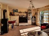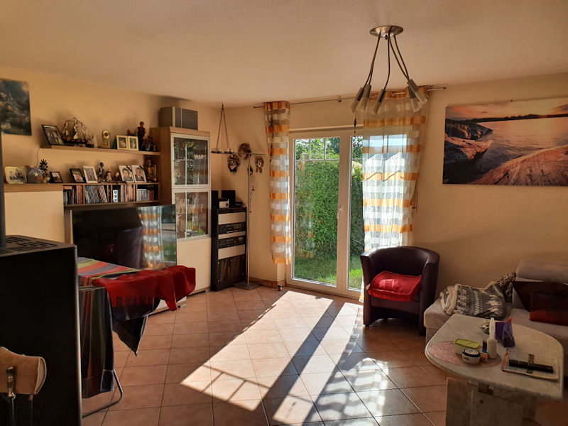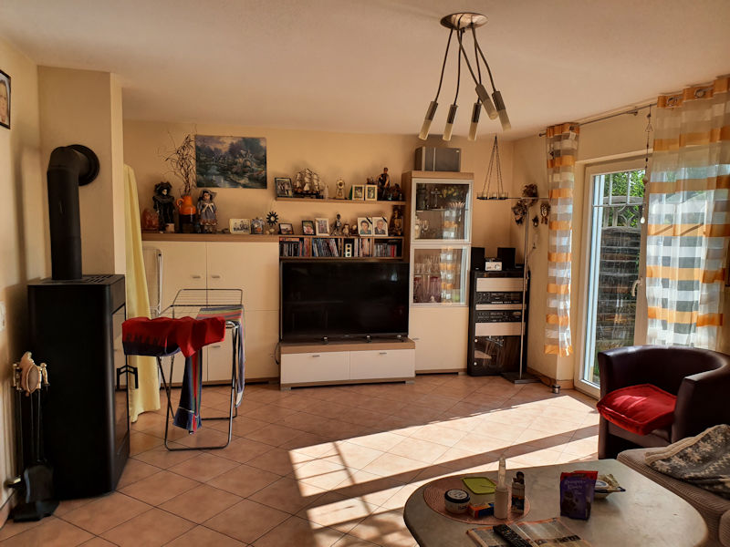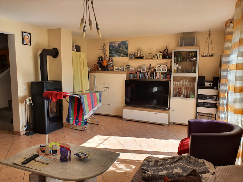 Wohnzimmer mit Essdiele, Holzofen und Terrasse,