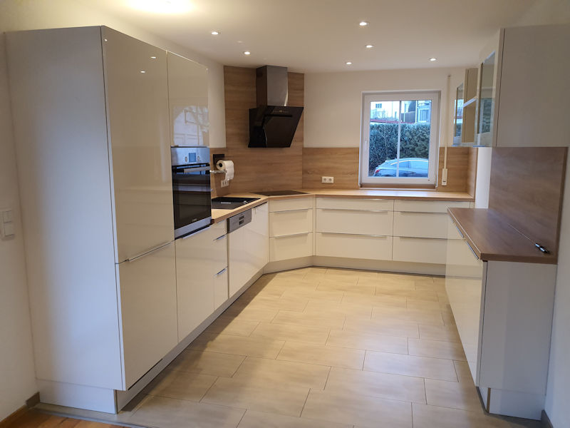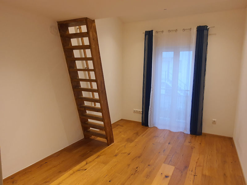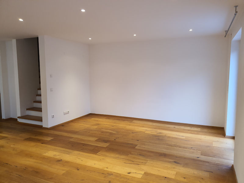 Wohnzimmer mit Essdiele, Holzofenanschluß, Küche mit Einbauküche und 2 Terrassen,